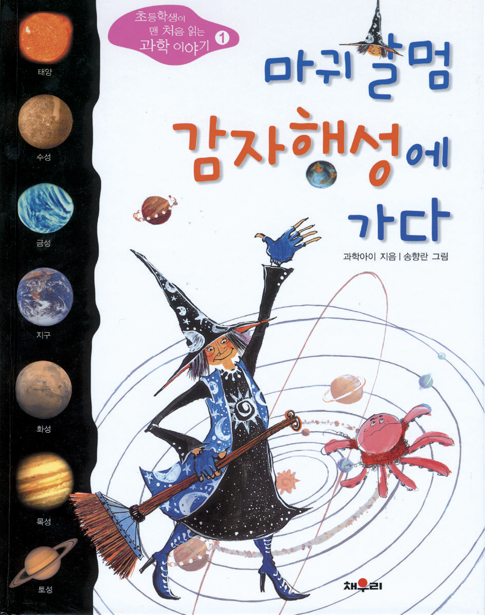 이번 시리즈는 이러한 현실적 반성 위에서 기획된 아이템입니다. 딱딱한 과학 개념을 쉽고 재미있게 전달하기 위해 마귀할멈과 쭈꾸미의 우주, 지구, 달 여행담을 동화로 전개해 나가면서 동기 부여를 하고 개념을 설명하고 있습니다. 그리하여 한 권, 한 권을 읽고 나면 각 권의 주제(이 책은 우주, 지구, 달 등 전 3권으로 구성됨)가 되는 우주, 지구, 달 관련 용어의 개념이 자연스럽게 정립되도록 구성하였습니다. 또한 애써 외우지 않아도 본문의 과학 정보가 머리에 쏙쏙 들어오도록 구성하였습니다.