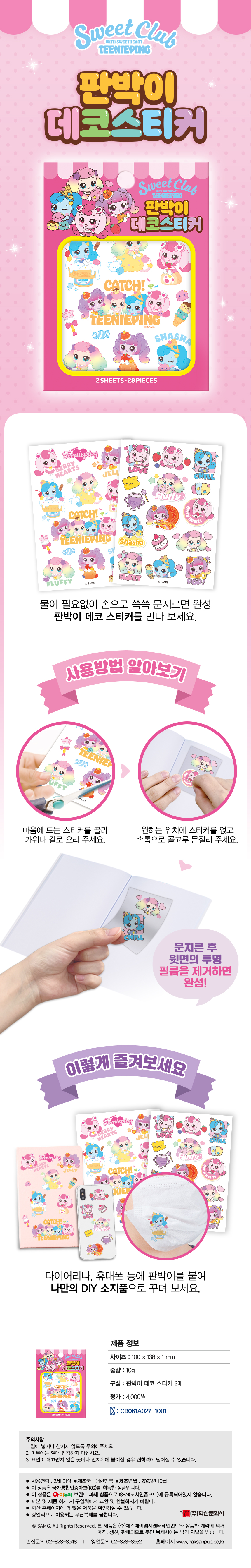 새콤달콤 캐치 티니핑 시즌4 판박이 데코스티커 캐릭터팀 스티커북 0 13666 2021.02.26 11:42 새콤달콤 캐치 티니핑 시즌4 판박이 데코스티커 가격 4,000원 사이즈 100 X138 X 1 mm 구성 판박이 데코 스티커 2매 중량 20g 제조년월 2023-10-25 제조국 대한민국 판매처 교보문고 예스24 알라딘 이전 상품 다음 상품 설명문구 어디에나 붙일 수 있는 판박이 데코스티커! 상세이미지 어디에나 붙일 수 있는 판박이 데코스티커!