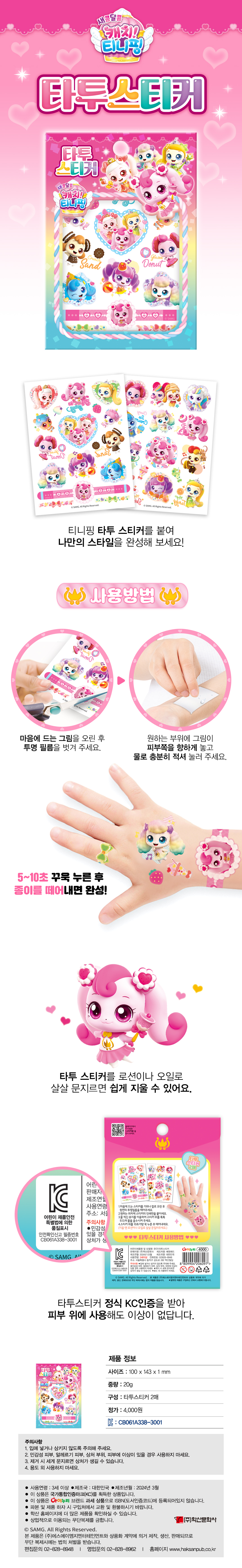 새콤달콤 캐치 티니핑 시즌4 타투스티커 캐릭터팀 스티커북 0 16623 2020.01.06 10:30 새콤달콤 캐치 티니핑 시즌4 타투스티커 가격 4,000원 사이즈 100X143X1 mm 구성 타투스티커 2매 중량 20g 제조년월 2024-03-15 제조국 대한민국 판매처 교보문고 예스24 알라딘 이전 상품 다음 상품 설명문구 알록달록 타투스티커로 개성만점 스타일 업! 상세이미지 알록달록 타투스티커로 개성만점 스타일 업!