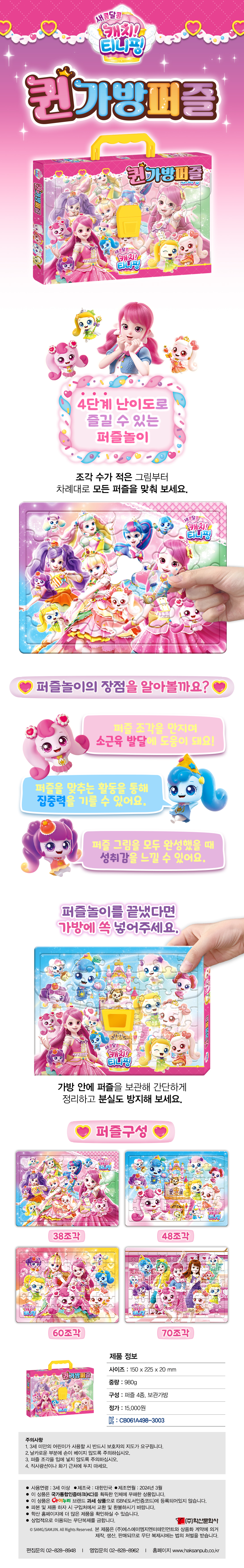 새콤달콤 캐치 티니핑 시즌4 퀸 가방퍼즐 캐릭터팀 아동퍼즐 0 15995 2020.04.24 09:18 새콤달콤 캐치 티니핑 시즌4 퀸 가방퍼즐 가격 15,000원 사이즈 310 X 225 X 20 mm 구성 보관가방, 퍼즐 4종 중량 980g 제조년월 2024-03-15 제조국 대한민국 판매처 교보문고 예스24 알라딘 이전 상품 다음 상품 설명문구 각각 다른 퍼즐 4종이 가방 속에 쏙! 상세이미지 각각 다른 퍼즐 4종이 가방 속에 쏙!